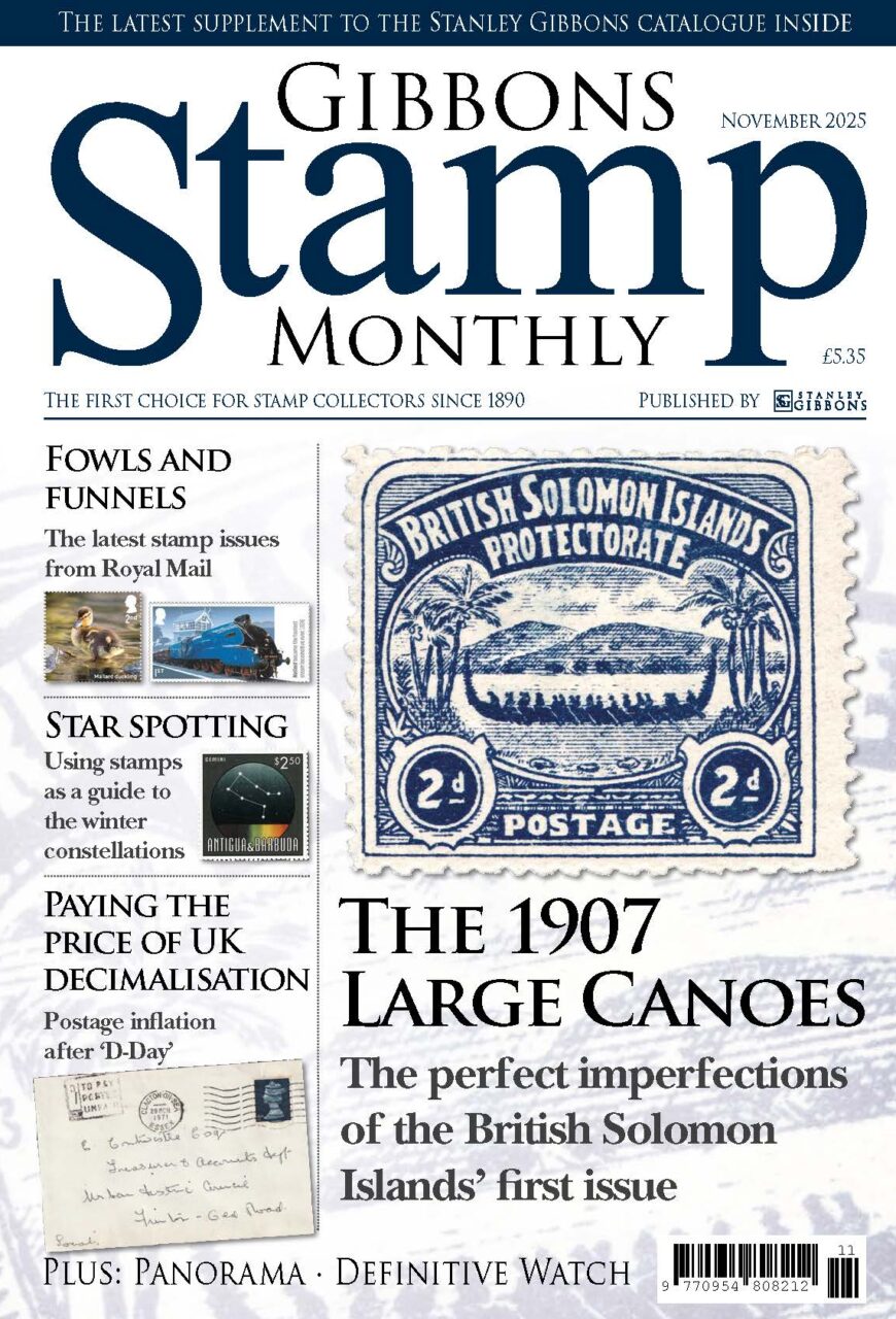 In the November issue of GSM, Nicholas Oughton introduces the first stamps of the British Solomon Islands, the flawed yet fascinating 1907 ‘Large Canoes’, exploring…